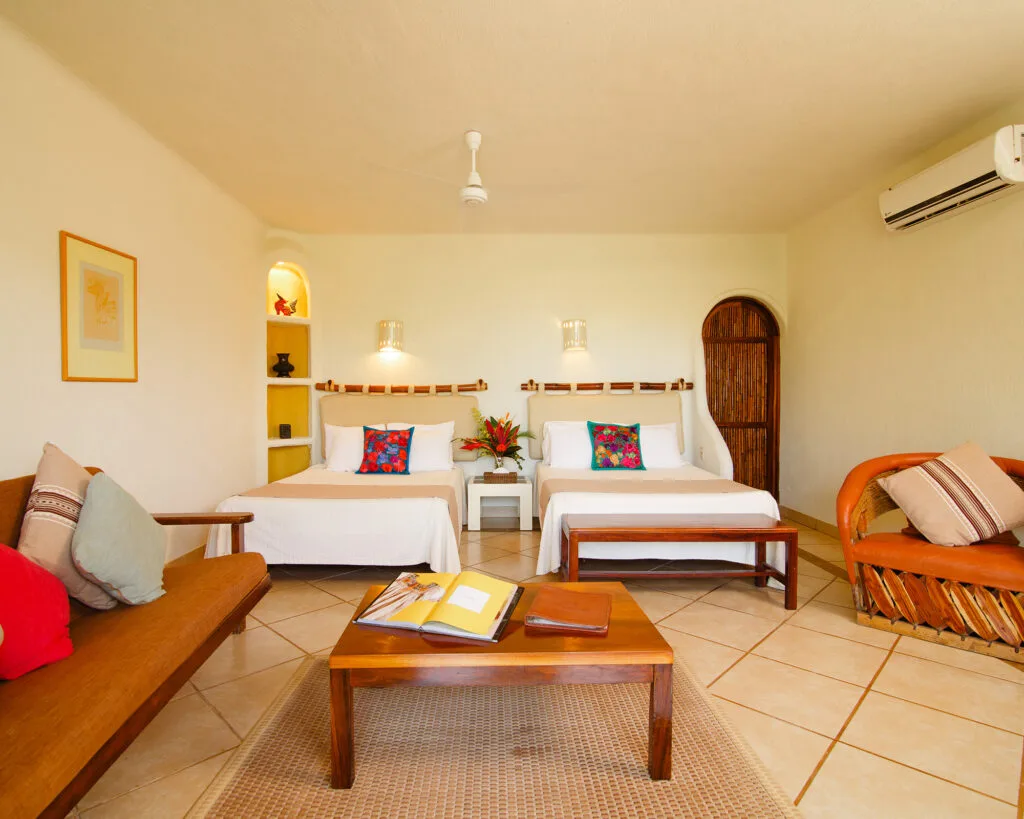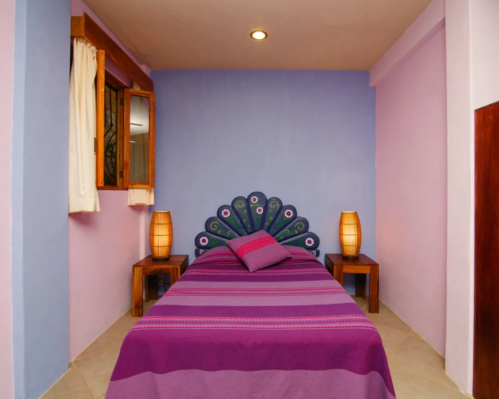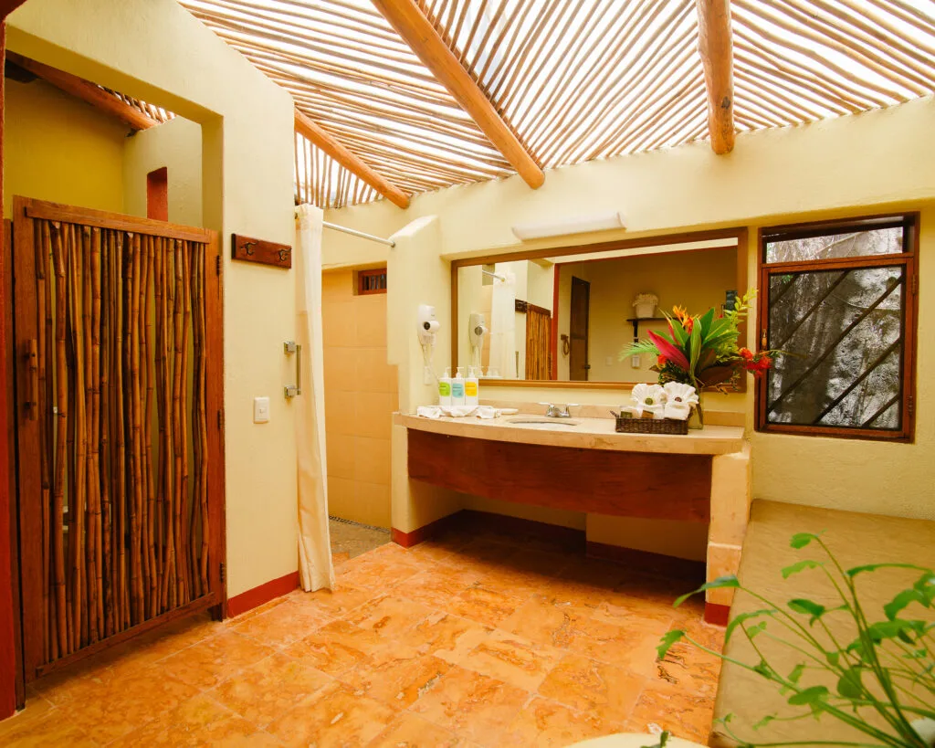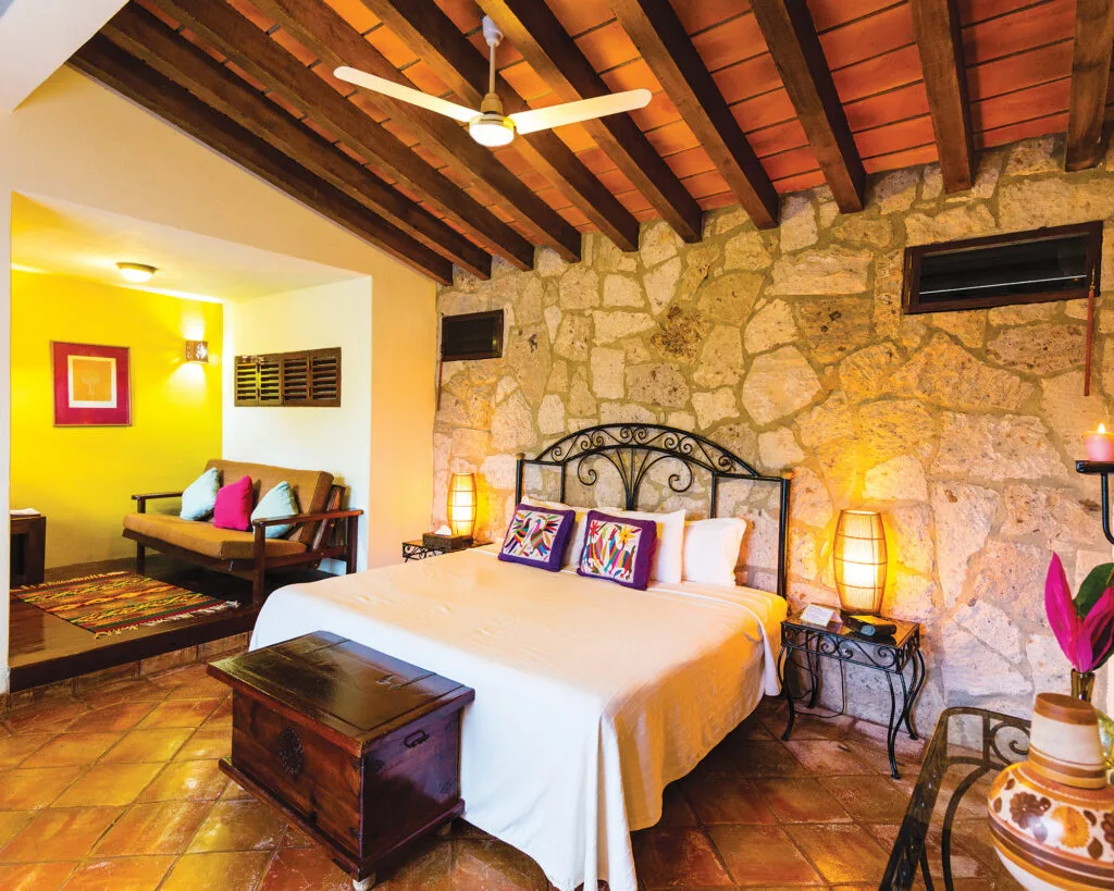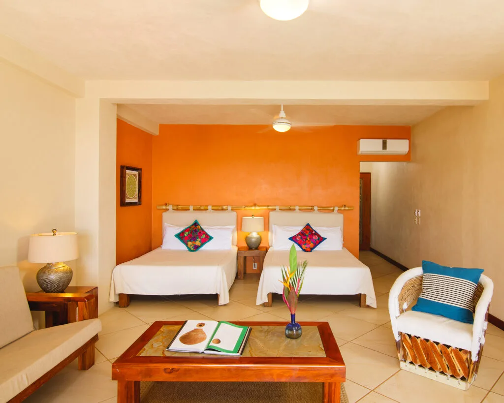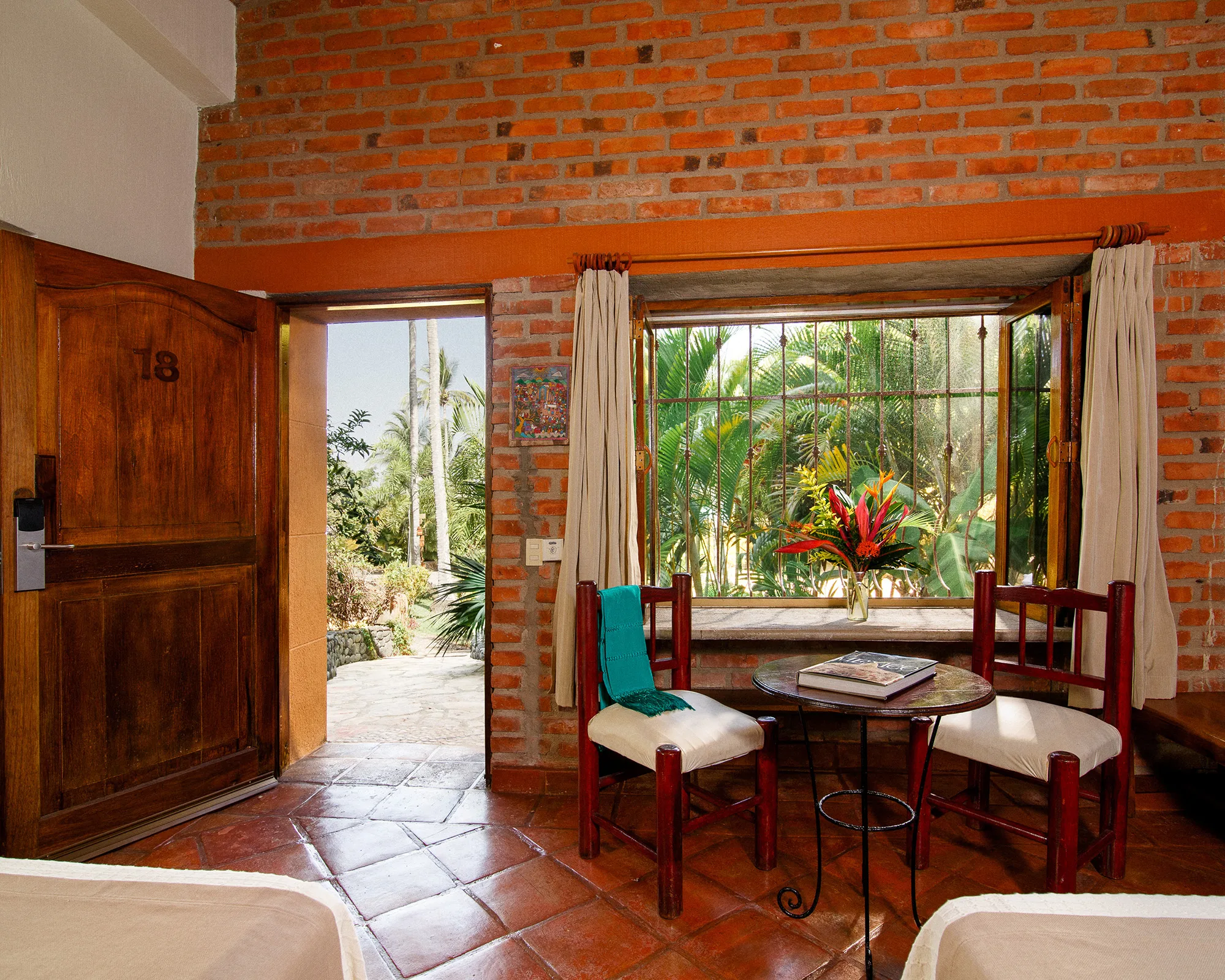 Guest Rooms are a simple yet comfortable option for one to two people, offering garden or jungle views. Decorated in bright and cheerful Mexican textiles and colors, they are cozy and well appointed. All rooms have en-suite bathrooms with natural bath amenities.