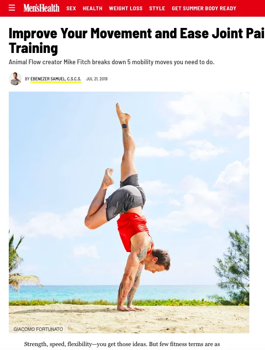 Improve Your Movement and Ease Joint Pain With Mobility Training"Strength, speed, flexibility—you get those ideas. But few fitness terms are as misunderstood as mobility. That’s why Mike Fitch, the 39-year-old trainer who created the Animal Flow bodyweight training method eight years ago, is never surprised when people ask what it is."