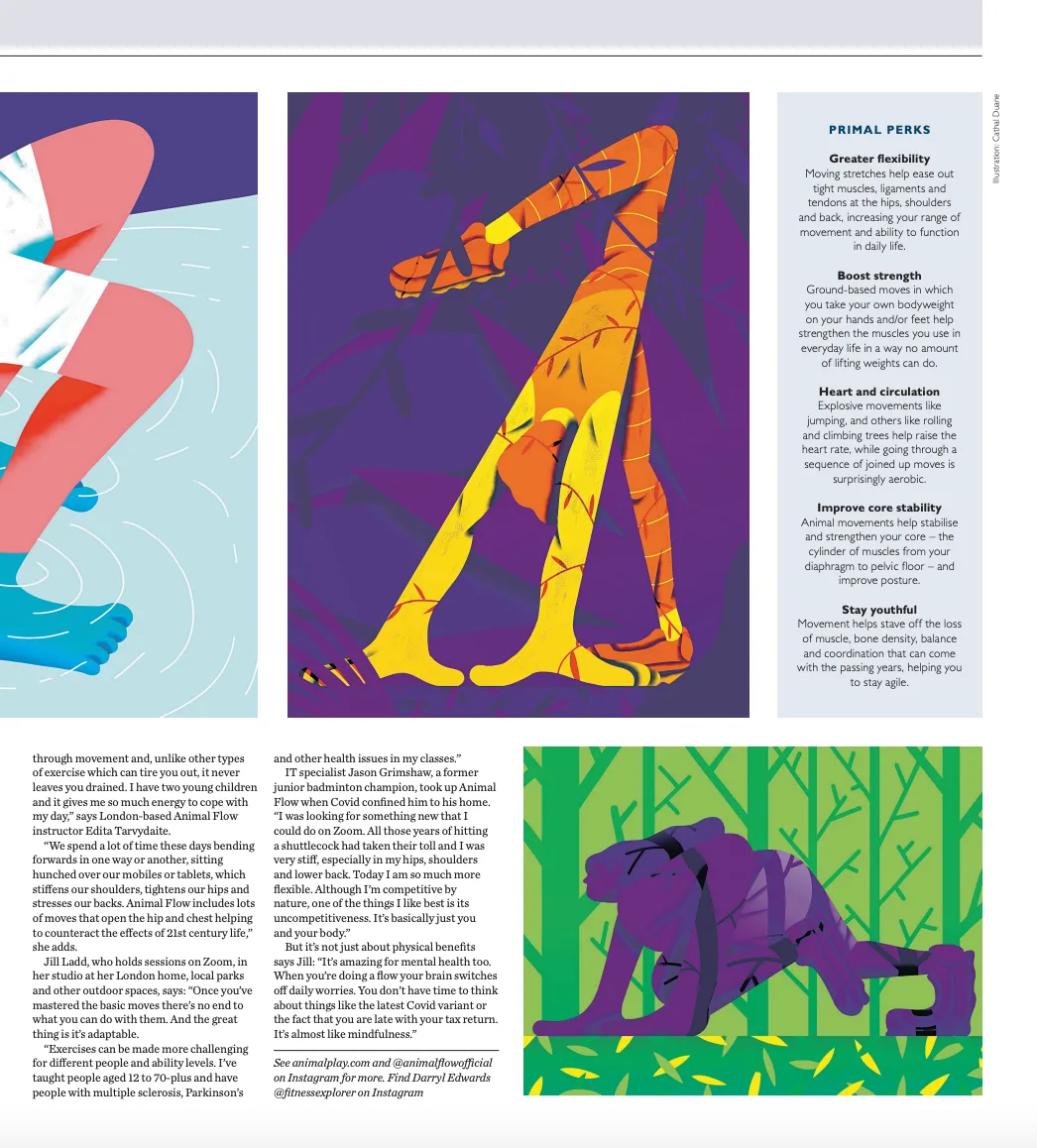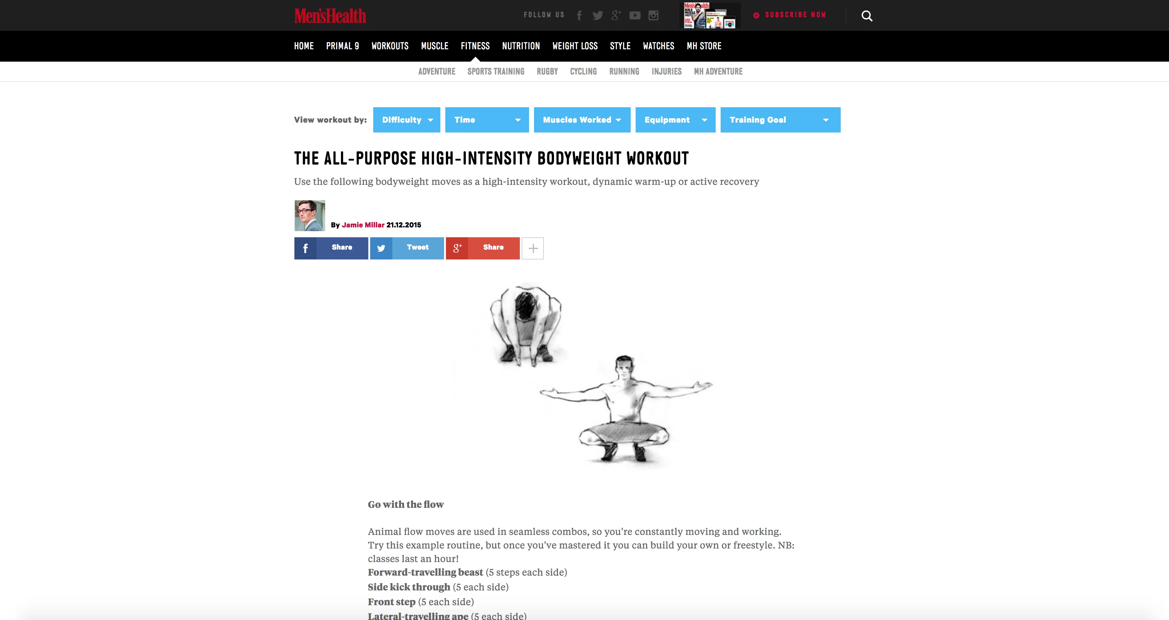 “That’s where Animal Flow comes in. This training system, invented by American coach Mike Fitch, is a combination of animal movement, strength training, martial arts, and gymnastics. Mastering these arts requires beastly levels of strength, and the grace and agility of a freerunnner, so the result is both eye-catching and highly effective.”