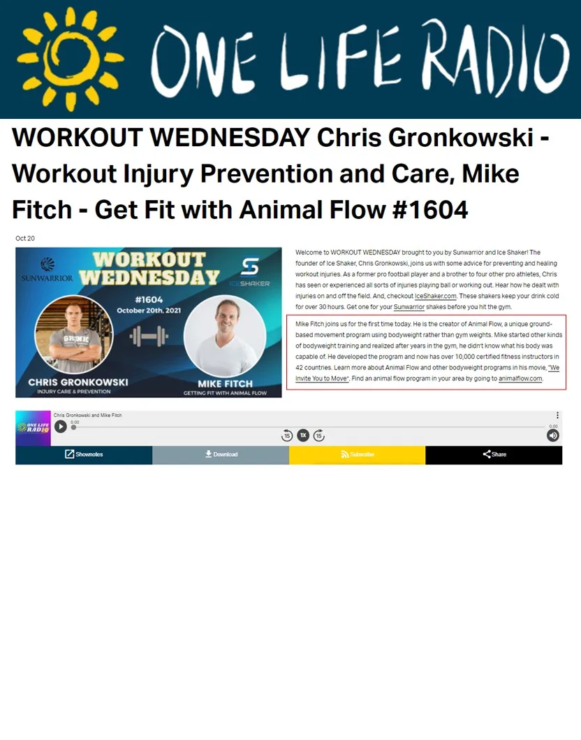 In the episode entitled, “Workout Injury Prevention and Care, Mike Fitch- Get Fit with Animal Flow #1604,” Mike discussed what animal flow is, what drew him to this style of exercise, the “We Invite You To Move” film, and the six components of Animal Flow. Mike stated, “The ground was a huge teacher to all of us during our developmental stages and unfortunately when we leave the ground, we become these upright bipedal human beings, we forget how powerful the ground was for us in our early stages and how powerful it can continue to be as we become older adults or teenagers or at whatever age.”