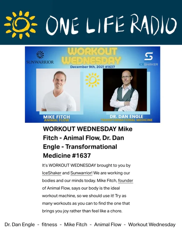 In the episode entitled, “WORKOUT WEDNESDAY Mike Fitch – Animal Flow, Dr. Dan Engle – Transformational Medicine #1637,” Mike discussed Animal Flow and why it’s a great workout to try in the new year. Mike stated, “It truly is all about how we inhabit our human animal vessels and move them through space and one of the great ways I found to be able to do that successfully is by putting hands and feet in contact with the ground and moving around.”